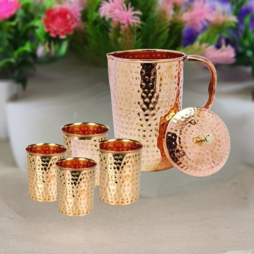 Elevate your dining experience with our exquisite Copper Hammered Jug with Glass Set. Handcrafted by skilled artisans, this set embodies a perfect blend of tradition and functionality. The jug and glasses are meticulously hammered to create a mesmerizing textured finish that not only enhances their aesthetic appeal but also ensures durability. Copper has been cherished for centuries for its natural cooling properties and health benefits, including boosting immunity and improving digestion. This elegant set is ideal for serving refreshing beverages while adding a vintage charm to your table. Whether you’re hosting a grand dinner party or enjoying a simple meal, this set brings a touch of heritage and sophistication to every sip.
